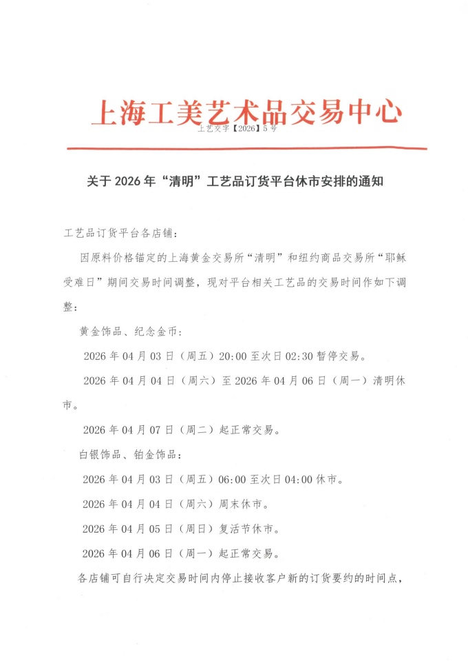 关于2026年“清明”工艺品订货平台休市安排的通知